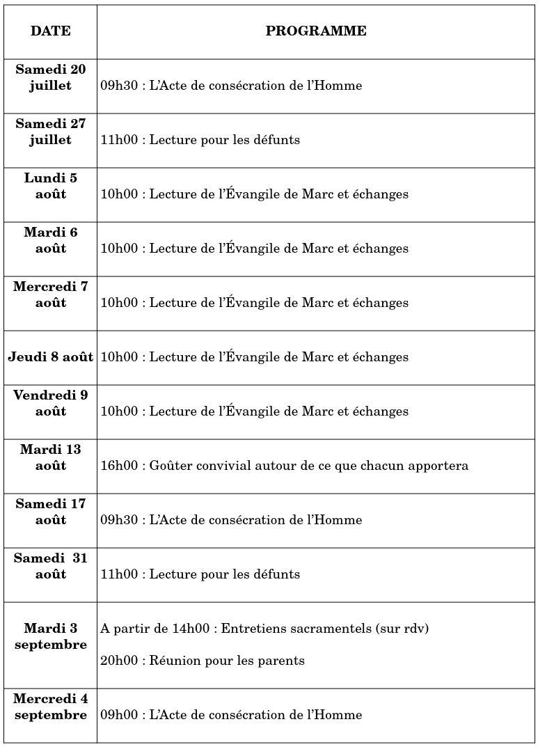 L’Acte de consécration de l’Homme sera célébré le mercredi 4 septembre au matin.