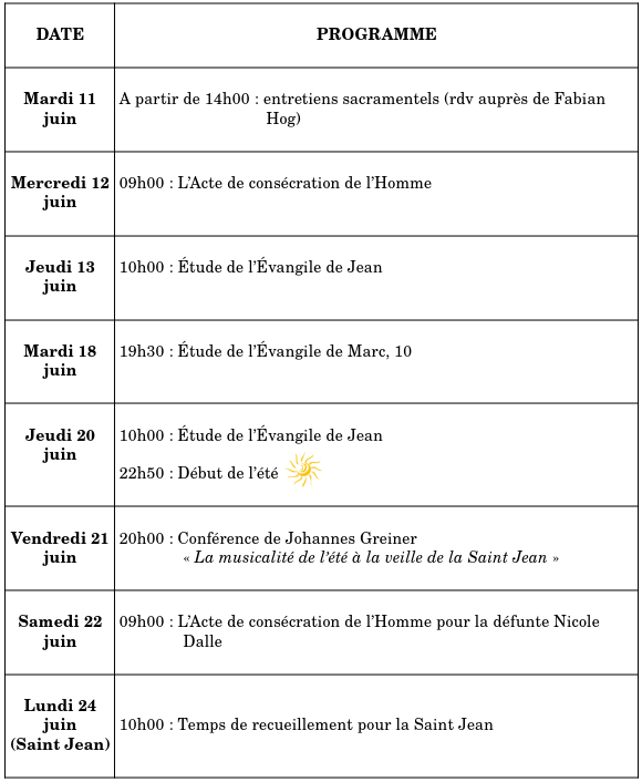 - les jeudi 13 et 20 juin à 10h00 pour l’étude de l’Évangile de Jean