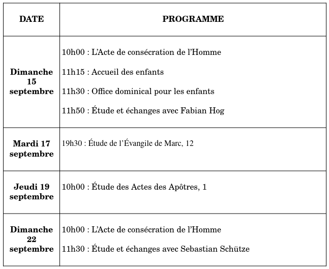 - le jeudi 19 septembre à 10h00 pour l’étude des Actes des Apôtres (chapitre 1)