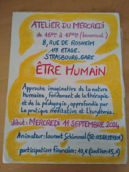 Cette année, Laurent Schimmel proposera également un atelier bimensuel, alliant pratique méditative et eurythmie, intitulé « Être humain ».