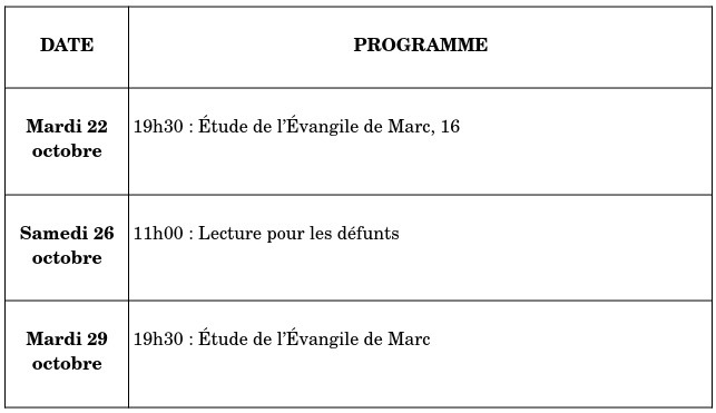 - les mardi 22 et 29 octobre à 19h30 pour l’étude de l’Évangile de Marc (chapitre 16)