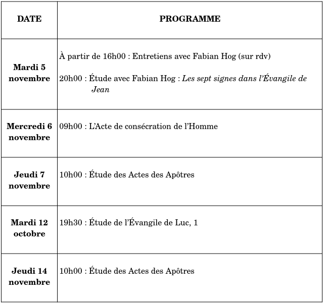 Les groupes d’étude du jeudi matin et du mardi soir se réuniront comme à leur habitude sauf le mardi 5 novembre où l’étude habituelle sera remplacée par celle proposée par Fabian Hog.