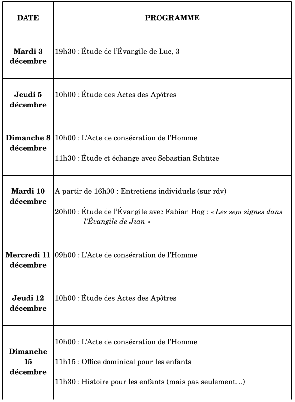 Fabian Hog sera aussi présent à Strasbourg le dimanche 15 décembre pour célébrer l’Acte de consécration de l’Homme et l’office dominical pour les enfants. Ces offices seront suivis d’une histoire pour les petits et les grands.