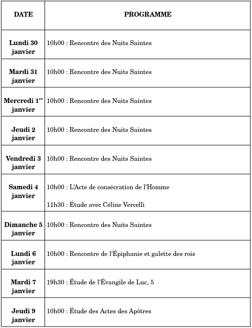 Le lundi 6 janvier, jour de l’Épiphanie, ce temps de recueillement sera suivi du partage de la galette des rois.