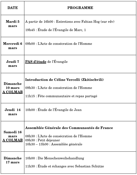 Le samedi 16 mars aura lieu, de 10h30 à 13h00, l’Assemblée Générale des Communautés de France à laquelle sont conviés tous les membres et amis. Elle sera précédée d’un Acte de consécration de l’Homme à 8h30 et d’un petit déjeuner.
