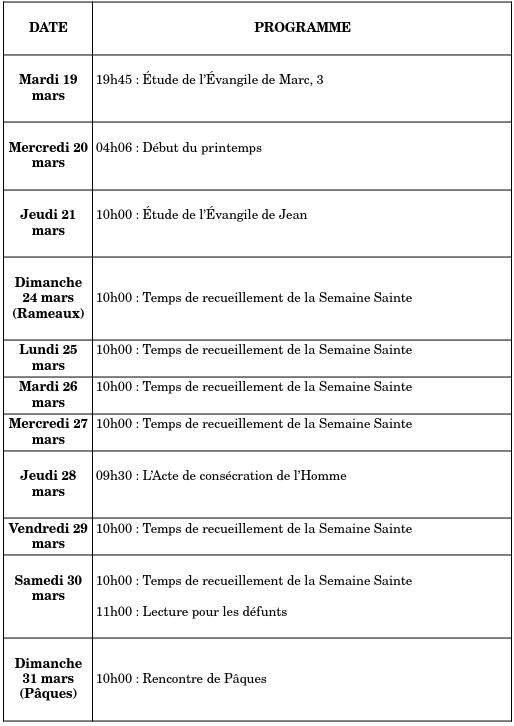 Les groupes d’étude du jeudi matin (Évangile de Jean) et du mardi soir (Évangile de Marc) se réuniront comme à leur habitude, sauf le jeudi 28 où il y aura un office.