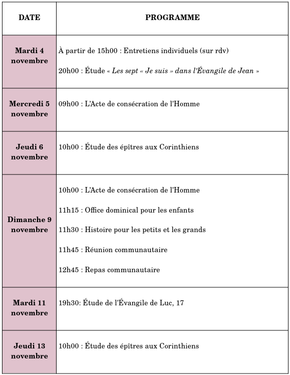 Les groupes d’étude du mardi soir (Évangile de Luc) et du jeudi matin (Épîtres aux Corinthiens) reprendront leurs réunions hebdomadaires cette quinzaine, sauf le mardi 4 novembre, où l’étude habituelle est remplacée par celle avec Fabian Hog.