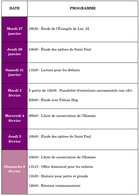 Les groupes d’étude du mardi soir (Évangile de Luc) et du jeudi matin (Épîtres de Saint Paul) se réuniront comme à leur habitude, sauf le mardi 3 février, où l’étude habituelle est remplacée par l’étude avec Fabian Hog.